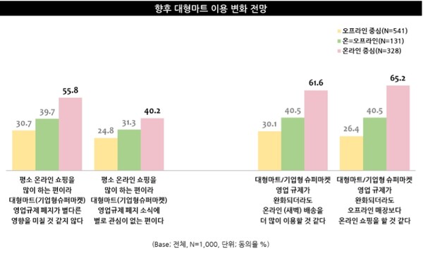 또한 의무휴업일이 평일로 변경되어도 매장 방문에는 큰 변화가 없을 것으로 전망(매장 방문 증가 예상 36.0%, 큰 변화 없을 것 55.5%, 매장 방문 감소 예상 2.7%, 잘 모름 5.8%)하고 있어, 의무휴업제도를 바라보는 대중들의 태도에 기대와 우려가 공존하고 있는 모습을 확인할 수 있었다. 특히, 온라인 쇼핑 비중이 높은 응답자를 중심으로 평소 온라인 쇼핑을 많이 하는 편이라 영업규제 폐지가 별다른 영향을 미칠 것 같지 않고(오프라인 중심 30.7%, 온=오프라인 39.7%, 온라인 중심 55.8%), 영업 규제가 완화되더라도 오프라인 매장보다 온라인 쇼핑을 할 것 같다(오프라인 중심 26.4%, 온=오프라인 40.5%, 온라인 중심 65.2%)는 응답이 두드러진 특징을 보여, 의무휴업 규제나 폐지만으로 대형마트의 경쟁력을 확보하거나 주변 상권을 활성화하는 데에는 어려움이 있어 보였다.