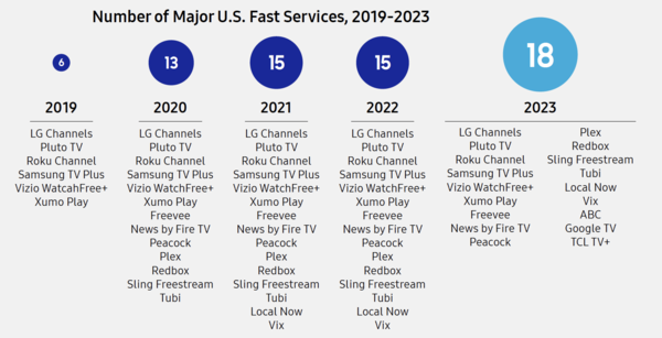 삼성 애즈의 새로운 보고서 <FAST 해독하기: 무료 광고 지원 스트리밍 환경에 대한 종합 가이드(Decoding FAST: A comprehensive guide to the Free Ad-Supported Streaming Landscape)>에 따르면, Fox의 Tubi, Vizio의 WatchFree+, Roku 채널, 파라마운트의 플루토 TV, 삼성의 삼성 TV 플러스와 같은 FAST 서비스의 수가 지난 4년 동안 3배로 증가했다.