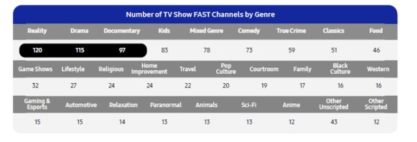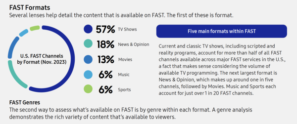 삼성 보고서에 따르면, 2020년에는 전체 시장에 걸쳐 FAST 채널이 614개에 불과했고 2023년에는 1,926개였다. 이 채널 중 상위 2개 형식은 TV 쇼와 뉴스 및 오피니언이다. TV 쇼는 미국 FAST 채널의 약 57%를 차지하는 형식으로 가장 큰 비중을 차지하고 있다.