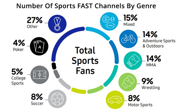 스포츠는 2020년 11월 45개에서 2023년 11월 114개로 증가(성장률 153%)한 장르이다. 스포츠의 주요 트렌드는 NFL, MLB, PGA 투어, NHL, FIFA와 같은 리그에서 자체 FAST 채널을 출시하는 것이다. 이러한 채널은 라이브 이벤트에 대한 권한은 없지만, 팬덤을 확장하는 역할을 하여 팬들이 다음과 같이 팬들이 좋아하는 스포츠에 더 깊이 참여할 수 있게 해준다.