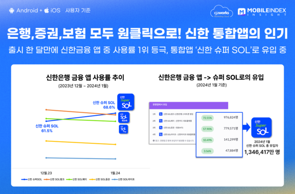 신한 통합앱 ‘신한 슈퍼 SOL’이 2024년 1월 약 68.6%의 사용률을 기록하면서 서비스 출시 약 한달만에 신한은행 금융 앱 중 가장 높은 사용률을 나타냈다.