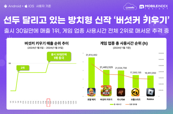 게임 앱 ‘버섯커 키우기’는 2024년 1월 20일 출시 한 달 만에 일간 매출 순위 1위를 차지했다. ‘버섯커 키우기’의 2024년 1월 총 사용시간은 약 2150만 시간으로, 같은 기간 ‘로블록스(약 1700만 시간)’ 총 사용 시간보다 약 450만 시간 많았다.