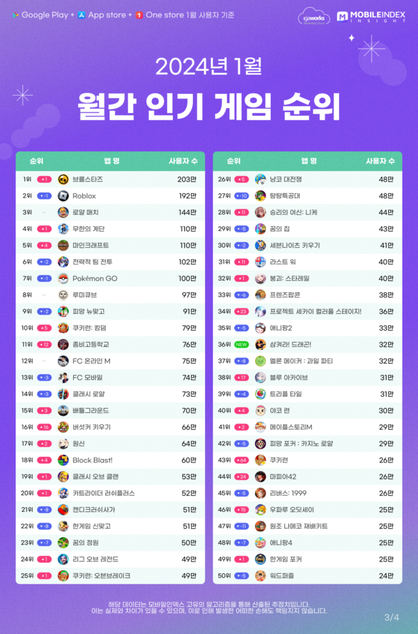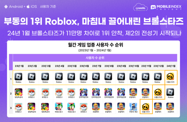 ‘브롤스타즈’는 2023년 11월 3위를 시작으로, 같은 해 11월 1위를 차지했다. 2023년 1월부터 12월까지 1위를 유지했던 ‘로블록스’는 2024년 1월 2위를 기록하면서 ‘브롤스타즈’에 1위를 넘겨줬다.