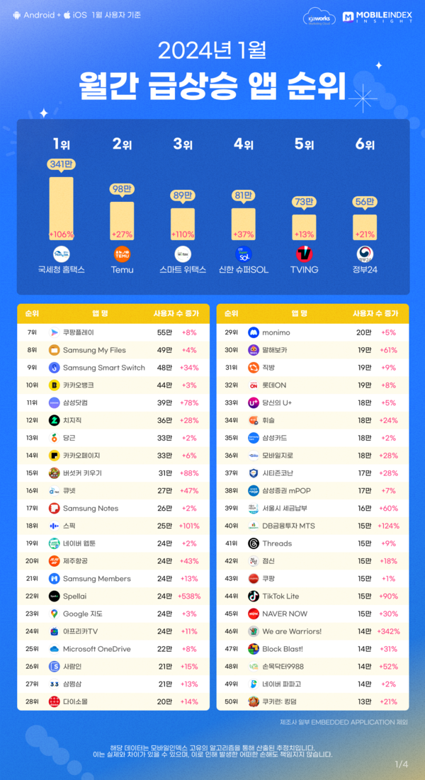 2024년 1월 ‘국세청 홈택스’ 341만 명의 사용자 증가(증가율 106%)를 기록하며 월간 급상승 앱 순위 1위를 차지했다. 같은 기간 ‘테무’는 약 98만 명 증가(증가률27%)한 2위, 사용자가 약 89만 명 증가(증가율 110%)한 ‘스마트 위택스’가 3위를 기록했다. ‘국세청 홈택스’, ‘스마트 위택스’, ‘스픽’, ‘Spellai’, ‘DB 금융투자 MTS’, ‘We are Warriors!’은 2024년 1월 100%가 넘은 사용자 증가율이 확인됐다.