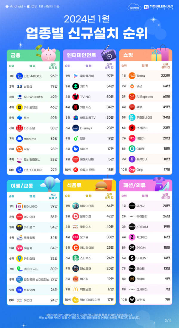 2024년 1월 업종별 신규 설치 순위 결과, ‘신한 슈퍼SOL(약 96만 건)’이 금융 앱에서 1위를 차지했다. ‘쿠팡플레이(약 97만 건)’, ‘테무(약 222만 건)’, ‘티머니GO(약 39만 건)’ 등이 각각 관련 업종에서 신규 설치 수 1위를 기록했다.
