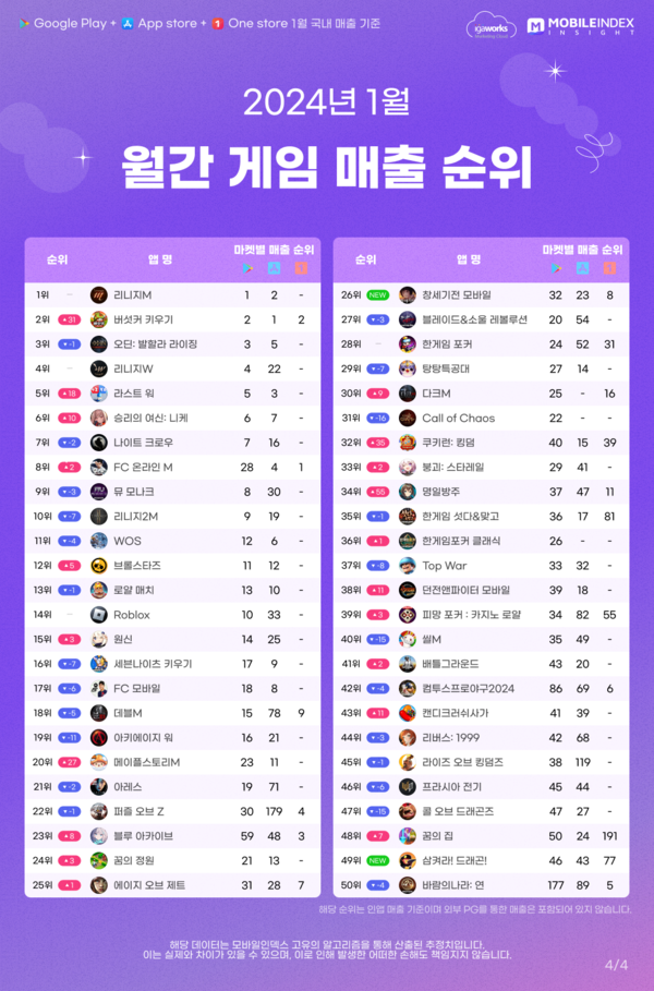 구글플레이, 앱스토어 및 원스토어 기준 국내 매출 순위 결과, 2024년 1월 ‘리니지M’이 1위로 나타났다. ‘리지니M’은 구글플레이에서 1위, 앱스토어에서 2위를 차지했다. 같은 기간 2위는 ‘버섯커 키우기’, 3위는 ‘오딘: 발할라 라이징’으로 확인됐다.