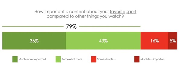 스포츠 팬은 다른 종류의 콘텐츠보다 스포츠에 더 많은 관심을 갖고 있으며, 거의 80%의 스포츠 팬이 시즌 동안 자신이 좋아하는 스포츠에 대한 콘텐츠가 TV에서 시청하는 다른 콘텐츠보다 더 중요하다고 말합니다. 3분의 1 이상(36%)이 다른 유형의 콘텐츠보다 훨씬 더 중요하다고 답했다.