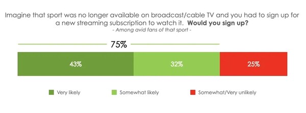 스포츠는 시청자가 어떤 플랫폼에 가입하는지에 영향을 미치는 힘이 있다고 허브는 발견했다. 스포츠 열성 팬 중 75%는 자신이 팔로우하는 스포츠를 시청하기 위해 필요한 경우 새로운 스트리밍 구독에 가입할 가능성이 있다고 말했다.