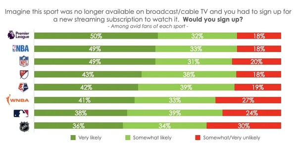 팬들은 다른 스포츠보다 일부 스포츠를 스트리밍으로 시청할 가능성이 더 높지만 일반적으로 열성적인 팬의 70~80%는 적어도 새 구독 추가를 고려할 것이라고 밝혔다. 특히 NFL, NBA, 프리미어 리그 팬 중 절반은 시청할 새로운 플랫폼이 필요한 경우 가입을 고려할 "가능성이 매우 높다"고 말했다.