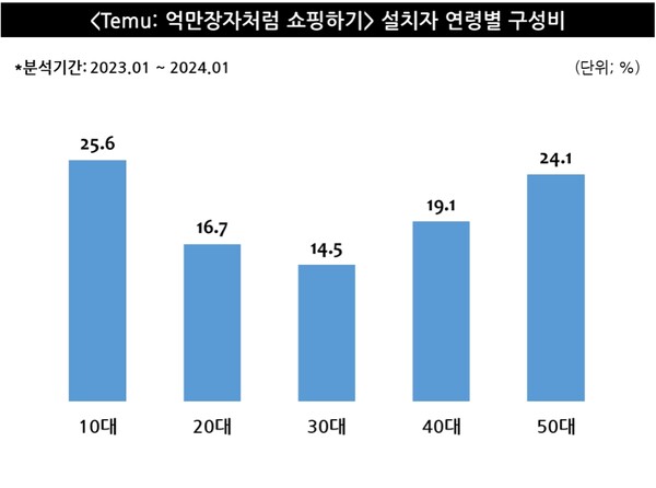 주목할 만한 점은 테무 설치자 중 10대와 50대의 설치 비중이 두드러진 결과를 보인 것으로 (10대 25.6%, 20대 16.7%, 30대 14.5%, 40대 19.1%, 50대 24.1%), 이는 50대 설치 비중이 가장 낮게 평가된 알리익스프레스(10대 24.3%, 20대 17.2%, 30대 20.1%, 40대 21.9%, 50대 16.6%)와 뚜렷한 차이를 보인 부분이었다. 파격적인 가격 혜택이 무기인만큼 상대적으로 경제력이 낮은 1020 세대를 중심으로 관심도가 높을 것이라는 예상과 달리 50대 고연령층까지 사용 연령대가 확대되고 있음을 짐작해 볼 수 있는 결과였다.