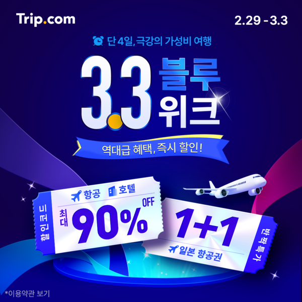 트립닷컴은 봄을 맞아 여행을 계획하는 상춘객을 위해 <3.3 블루 위크(Blue Week)>를 시작한다고 밝혔다. 행사는 이달29일부터 다음 달 3일까지 총 4일간 진행되며 선착순으로 다운받을 수 있는 할인 코드와 반짝 특가를 위한 알림 설정은 지금부터 가능하다.