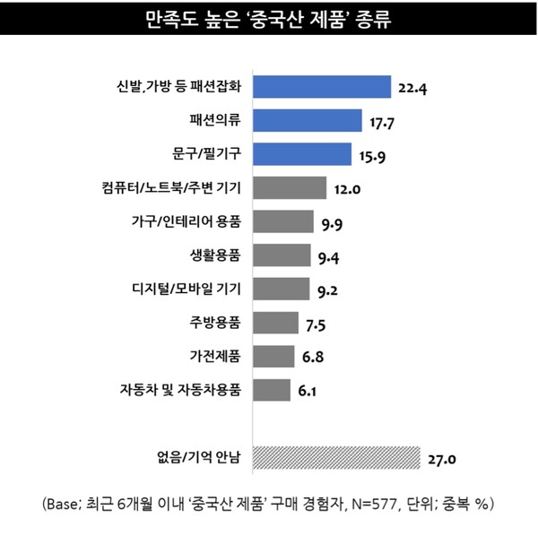 실제로 구매 경험이 있는 중국산 제품 중에서는 품질이나 기능보다는 가성비적 요소가 중요한 ‘패션잡화(22.4%, 중복응답)’, ‘패션의류(17.7%)’, ‘문구/필기구(15.9%)’에 대한 만족도가 상대적으로 높은 편이었으며, 구매 의향이 있는 제품군에서도 이와 비슷한 결과를 확인할 수 있었다(패션 잡화 25.9%, 문구/필기구 23.6%, 패션의류 22.1%).