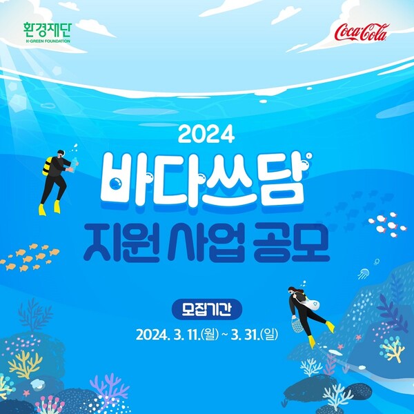 한국 코카-콜라가 환경재단과 함께 해양 환경 보호활동인 ‘바다쓰담 캠페인’ 참여 팀(단체 포함)을 모집한다. 모집 기간은 3월 31일(일)까지이며 해양 환경 보호활동을 수행할 수 있는 팀이라면 누구나 신청 가능하다. 최종 선정된 12개 팀에게는 각각 500만 원의 활동비를 지원한다.