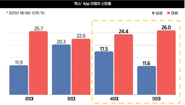 주목할 만한 점은 4050세대를 중심으로 한 토스의 성장세다. 토스의 경우 4050세대의 이용자 비율이 모두 20% 이상을 기록하면서 전 연령대에 걸쳐 이용자가 확대되고 있음을 확인할 수 있었다(20대, 24.1%, 30대 22.8%, 40대 26.1%, 50대 27.0%). 특히 여성 고연령층에서 남성 대비 좀 더 뚜렷한 증가폭을 보였는데(40대 남성 17.5%, 40대 여성 24.4%, 50대 남성 11.6%, 50대 여성 26.0% - 우측 그래프 참조), 이는 그동안 인터넷 전문은행이 젊은 세대의 전유물로 여겨지던 것과 달리, 여성 고연령층 이용자가 플랫폼 성장을 견인하는 역할을 대체하고 있음을 엿볼 수 있는 결과였다.