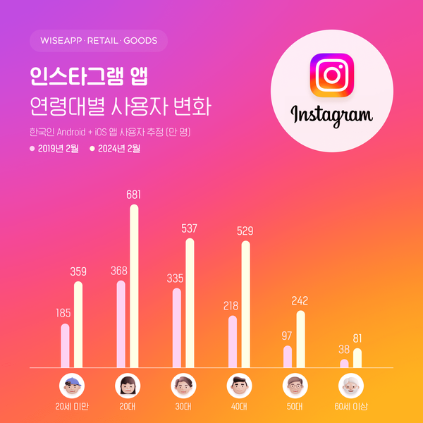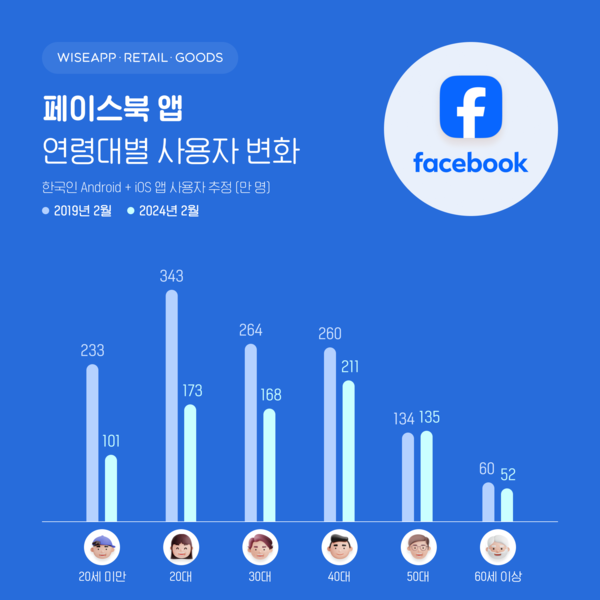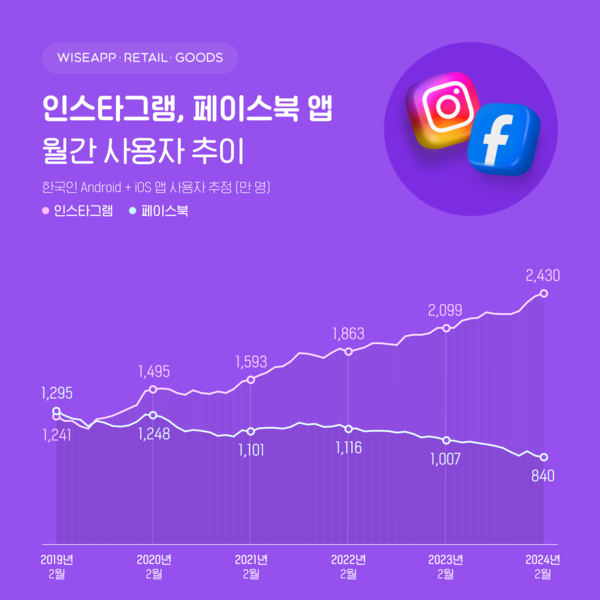페이스북 앱 사용자는 19년 2월 1,295만 명에서 24년 2월 840만 명으로 지난 5년 동안 사용자가 35%나 감소했다. 반면, 인스타그램 앱 사용자는 19년 2월 1,241만 명에서 24년 2월 2,430만 명으로 지난 5년 동안 사용자가 96%나 증가했다.