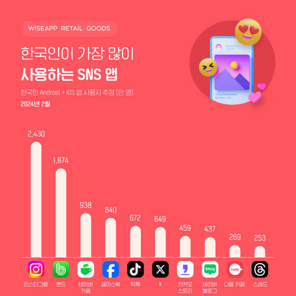 또한, 지난 2월 한국인이 가장 많이 사용한 SNS 앱은 인스타그램, 밴드, 네이버카페, 페이스북, 틱톡, X, 카카오스토리, 네이버블로그, 다음카페, 스레드 순이었다.