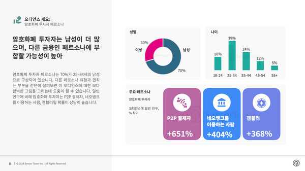 센서타워 오디언스 인사이트에 따르면 ‘암호화폐 투자자’ 페르소나는 70%가 25~34세의 남성으로 구성된 것으로 나타났다. 또한 ‘암호화폐 투자자’는 일반 인구에 비해 ‘P2P 결제자’, ‘네오뱅크를 이용하는 사람’, ‘갬블러’일 확률이 높아 다른 금융인 페르소나에 부합할 가능성이 높았다.