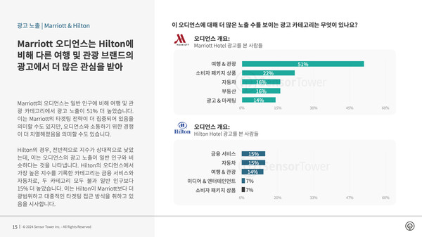 ‘메리어트’의 오디언스는 일반 인구에 비해 여행 및 관광 카테고리에서 광고 노출이 51% 더 높았다. 이는 ‘메리어트’의 타기팅 전략이 더 집중돼 있음을 의미할 수도 있지만, 오디언스와 소통하기 위한 경쟁이 더 치열해졌음을 뜻할 수도 있다.