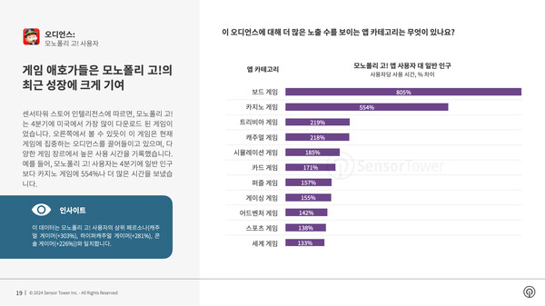 마지막으로 리포트의 ‘앱 인게이지먼트’ 섹션에서 2023년 4분기 미국에서 가장 많이 다운로드 된 게임인 ‘모노폴리 고!’의 오디언스에 대해 살펴보면 현재 게임에 집중하는 오디언스를 끌어들이고 있으며, 다양한 게임 장르에서 높은 사용 시간을 기록했다. 예를 들어 ‘모노폴리 고!’ 사용자는 4분기에 일반 인구보다 카지노 게임에 554%나 더 많은 시간을 보냈다.