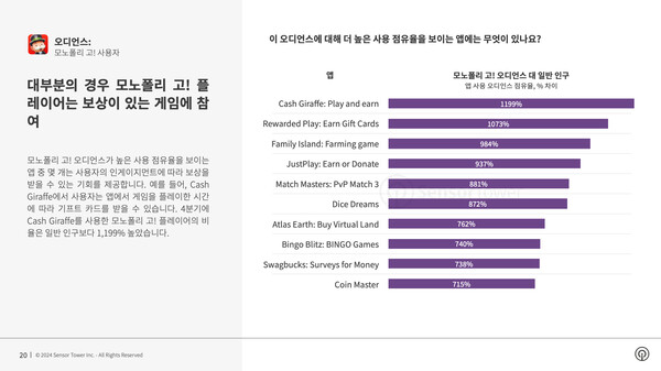 또한 ‘모노폴리 고!’ 오디언스가 높은 사용 점유율을 보이는 앱 중 몇 개는 사용자의 인게이지먼트에 따라 보상을 받을 수 있는 기회를 제공한다. 예를 들어 ‘Cash Giraffe’에서 사용자는 앱에서 게임을 플레이한 시간에 따라 기프트 카드를 받을 수 있다. 4분기에 미국에서 ‘Cash Giraffe’를 사용한 ‘모노폴리 고!’ 플레이어의 비율은 일반 인구보다 1199% 높았다.