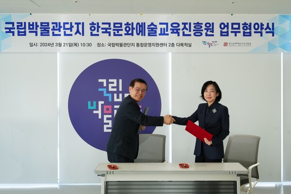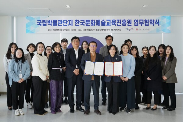 한국문화예술교육진흥원(원장 박은실, 이하 교육진흥원)은 행정중심복합도시 국립박물관단지 통합운영지원센터(이사장 정갑영, 이하 국립박물관단지)와 <어린이·가족 문화예술교육 콘텐츠 공동개발> 업무협약을 21일 세종시 국립박물관단지에서 체결했다.