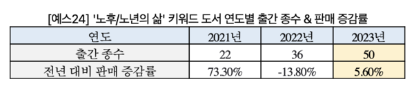 한편 실질적인 측면을 넘어 노년, 그와 함께 연상되는 죽음에 대해 심리적으로 접근하는 도서들도 꾸준히 인기를 얻어 관심을 모았다. 예스24 집계 결과, 2023년 '노년·죽음' 관련 인문서 출간 종수는 61종으로 전년 57종에서 소폭 증가했다. 또한, 판매량은 최근 3년간 매년 증가 추세로 2023년에는 전년 대비 32.9% 늘었다.