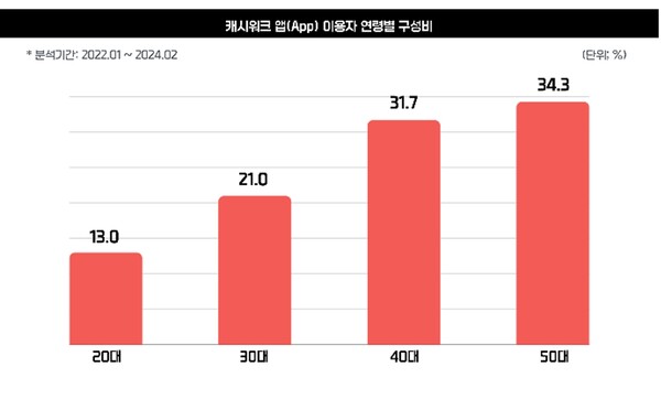 또한 캐시워크 앱의 경우 2024년 1월 기준 2022년 1월 평균 대비 이용률이 소폭 증가(13.9%)한 결과를 확인할 수 있었는데, 고물가가 지속되면서 생활비를 조금이라도 아껴보자는 심리가 작용된 것으로 짐작된다. 이는 엠브레인 트렌드모니터가 지난해 4월 자체 조사한 결과에서도 유사한 흐름을 살펴볼 수 있었다. 고연령층일수록 ‘짠테크’에 대한 호감도가 타 연령층 대비 두드러진 결과를 보였는데(20대 49.2%, 30대 52.8%, 40대 56.4%, 50대 57.6%), <티끌 모아 태산>이란 신념에 동의하는 비율이 높은 만큼(20대 47.6%, 30대 46.8%, 40대 53.2%, 50대 64.0%) 4050세대가 소소한 소득을 얻기 위한 일환으로 캐시워크와 같은 앱을 적극 활용하고 있음을 엿볼 수 있었다.