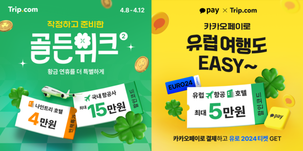 이번 이벤트는 트립닷컴 앱 및 웹사이트의 유럽여행 특가 페이지에서 카카오페이로 상품 예약 시 참여 가능하다. 트립닷컴은 유럽노선 항공 예약 시 최대 5만원, 호텔 10만원 이상 예약 시 2만원을 할인 받을 수 있는 할인코드도 함께 발행한다.