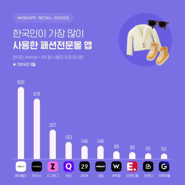 와이즈앱·리테일·굿즈가 한국인 스마트폰 사용자(Android + iOS)를 표본 조사한 결과, 24년 3월 한국인이 가장 많이 사용한 패션 전문몰 앱은 에이블리로 지난 한 달 동안 805만 명이 사용한 것으로 조사됐다.