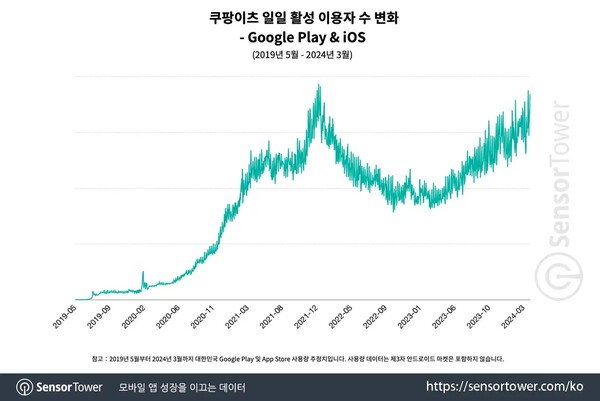 센서타워 스토어 인텔리전스에 따르면, 2023년 3월 이후 《쿠팡이츠》의 일일 활성 사용자 수(DAU)는 꾸준한 상승세를 보이며 2024년 3월 31일 최고치에 달했습니다. 이는 2021년 12월 이후 가장 높은 수치였습니다(구글 플레이 스토어 및 애플 앱스토어 통합 추정치).