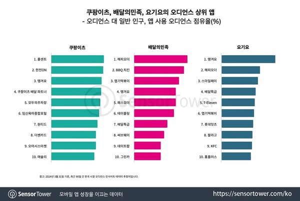 《배달의민족》 오디언스들이 일반 인구 대비 더 많이 사용하는 상위 10개 앱 중 5개가 《BBQ 치킨》, 《엽기떡볶이》 등과 같이 음식점 자체 주문 및 배달 앱 또는, 《해피오더》와 같이 일반 배달 앱에 속했습니다. 마찬가지로 《요기요》 오디언스도 상위 10개 앱 중 5개가 배달 앱이 차지하고 있어, 《쿠팡이츠》 비교했을 때 《배달의민족》와 《요기요》 오디언스들의 배달 앱에 대한 높은 선호도를 보여줍니다.