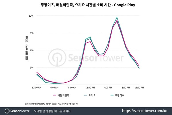 또한 《쿠팡이츠》 사용자는 배달앱 사용량이 가장 높은 시간대인 오후 6시에 경쟁사 대비 소비 시간이 가장 높습니다. 또한, 그다음 높은 시간대인 오후 5시, 오후 12시, 오전 11시에도 가장 높은 소비 시간을 보이고 있습니다. 이는 배달 앱 사용이 가장 활발한 시간대에 경쟁사들을 제치고 사용자를 사로잡을 수 있는 《쿠팡이츠》의 능력을 보여줍니다.