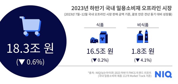 글로벌 소비자 인텔리전스 기업 NIQ(닐슨아이큐) 코리아는 2023년 하반기(7~12월) 국내 일용소비재 판매액 규모가 약 18조 원으로 전년 동기 대비 0.6% 감소하며 역성장으로 전환했다고 발표했다. 판매액을 기준으로 식품군(-0.2%, 16조 4550억 원)과 비식품군(-4.1%, 1조 8000억 원) 모두 전년 동기 대비 마이너스 성장률을 기록했다.