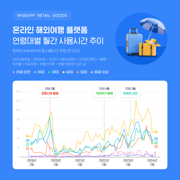 온라인 해외여행 플랫폼 앱 사용시간 세대별 1위는 40대, 2위는 20대