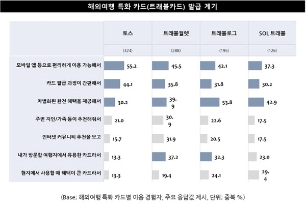 여행 특화 카드 중에서 토스(32.4%, 중복응답), 트래블월렛(28.8%), 트래블로그(19.5%), SOL트래블(12.6%) 순으로 이용 경험이 많았으며, 모바일 앱으로 편리하게 이용할 수 있고, 카드 발급 과정이 간편하다는 점을 발급 이유로 언급하는 경우가 많았다. 또한 ‘차별화된 환전 혜택’을 응답하는 비율도 적지 않아, 이용 편의성과 타 카드 대비 활용도 높은 혜택을 받을 수 있다는 점을 높게 평가하고 있음을 확인할 수 있었다.