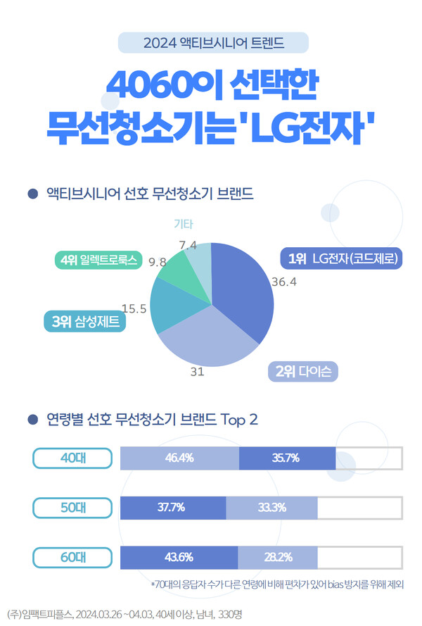 시니어 소셜벤처 임팩트피플스가 2024년 액티브시니어의 무선청소기 이용 트렌드 조사를 진행한 결과, ‘LG전자(코드제로)’를 가장 많이 사용하는 것으로 나타났다.