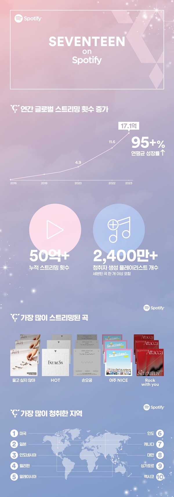 아울러, 스포티파이는 세븐틴의 주요 스트리밍 데이터를 공개했다. 세븐틴은 2015년 데뷔 이래 스포티파이에서 50억 회 이상의 스트리밍을 기록했으며, 리스너가 직접 생성한 플레이리스트 중 세븐틴의 곡을 포함한 플레이리스트만 2천 4백만 개가 넘는 것으로 나타났다. 특히 스포티파이 내 세븐틴 음악의 글로벌 스트리밍 횟수는 연평균 95% 이상의 성장세를 보이며 8년 동안 약 60배 이상 증가했다.