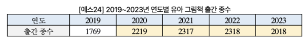 문화콘텐츠 플랫폼 예스24 집계 결과, 2020년 이후 매년 2천 종 이상의 그림책이 출간된 것으로 나타났다. 2023년에는 전년 대비 출간 종수가 소폭 감소했으나 꾸준히 출간 흐름을 이어 가고 있는 점이 눈에 띈다.