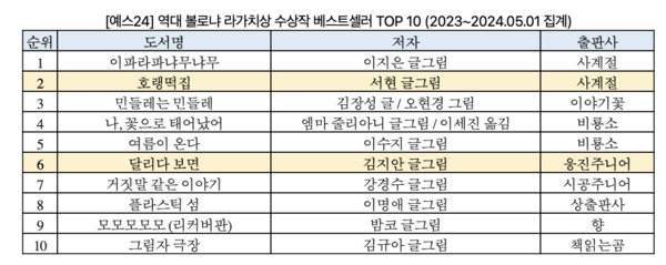 올해 만화(초등) 부문 수상작 <호랭떡집>과 <달리다 보면>은 2023~2024년 역대 볼로냐 라가치상 수상작 베스트셀러에서 각각 2위와 6위를 달성했다. 1위는 2021년 대상 수상작인 이지은 작가의 <이파라파냐무냐무>가 차지했다.