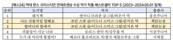 한편, 한스 크리스티안 안데르센상의 경우에는 올해 그림 부문 수상자인 시드니 스미스 작가의 작품 <나는 강물처럼 말해요>, <할머니의 뜰에서> 2권이 2023~2024년 역대 안데르센상 수상 작가 작품 베스트셀러 5위권에 이름을 올렸다.