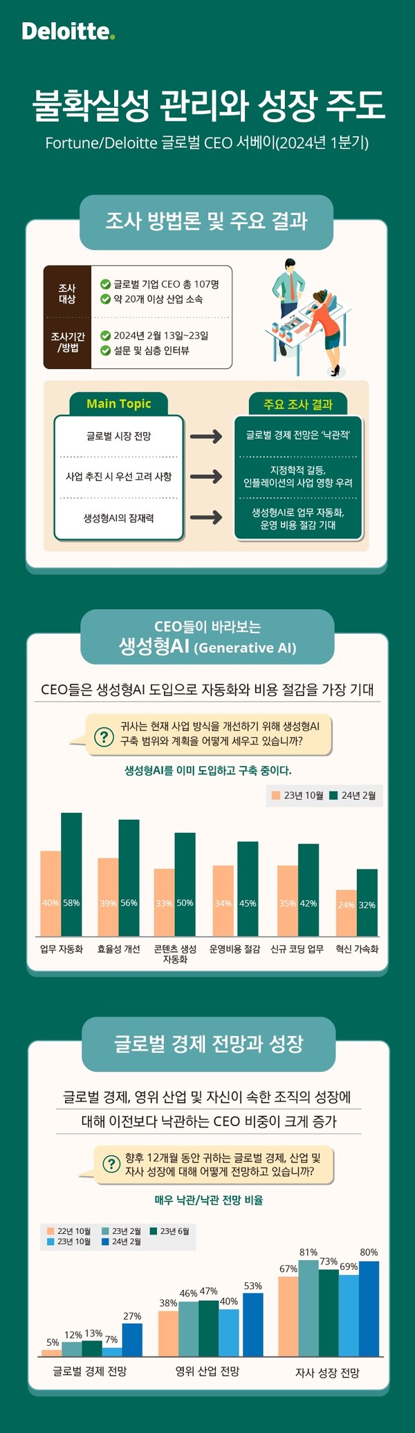 손재호 한국 딜로이트 그룹 성장전략본부장은 “보고서에 따르면 글로벌 CEO 들은 올해 경영환경을 도전적으로 보고 있지만 기업과 산업 성장에 대해서는 낙관적으로 전망하고 있다. 또한, 기업 운영 비용 최적화에 집중하고, 생성형 AI와 같은 새로운 기술을 자사의 비즈니스 모델에 통합하려는 노력을 지속하고 있다. 이 가운데 기업들은 지정학적 불안정, 글로벌 규제 등 외부 위협요인을 정확히 인식하고 면밀하게 대응책을 세울 필요가 있다”며 “보고서의 인사이트가 불확실한 전망 속에서 사업 기회 포착과 전략 마련에 도움이 되기를 바란다”고 말했다.