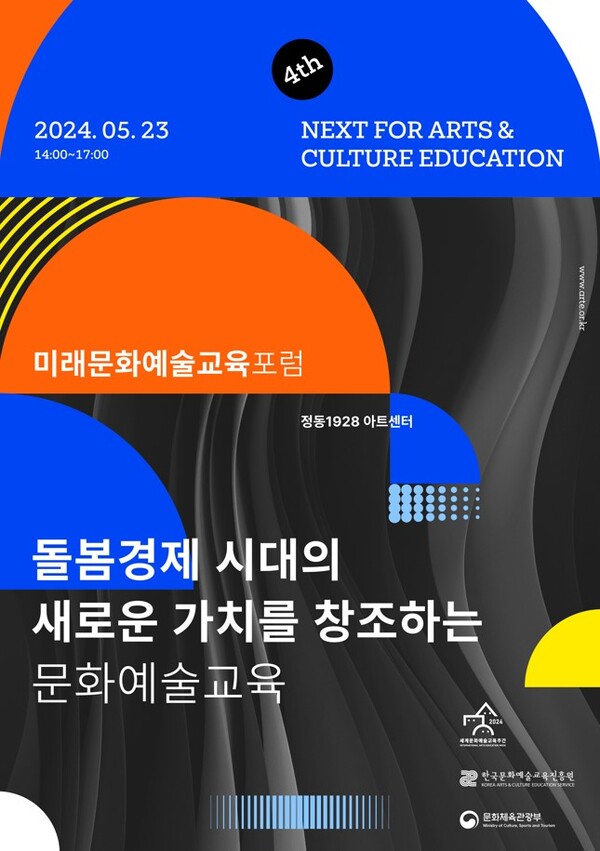 이어 23일(목)에는 ‘돌봄경제 시대의 새로운 가치를 창조하는 문화예술교육’을 주제로 ‘제4회 미래 문화예술교육 포럼’을 정동1928 아트센터에서 개최한다. 홍콩과학기술대학교 김현철 교수의 기조발제를 시작으로 ▲미래 인적자원 함양을 위한 돌봄체계 완성과 문화예술교육 정책(신의진 연세대 교수), ▲시니어 라이프스타일 변화에 따른 선진적 시니어 문화예술교육 시스템(이두희 고려대 명예교수), ▲콜롬비아 메데진시의 도시 교육혁신정책 사례(콜롬비아 ITM 시립대 총장), ▲미래세대와 청년을 위한 문화예술 활동 및 교육실천 사례(프로젝트플래닛 박지원 대표, 청년채움 이학준 대표) 등 사회 전반에 걸쳐 나타나는 돌봄 이슈와 연계한 문화예술교육의 정책적 역할을 논의한다.