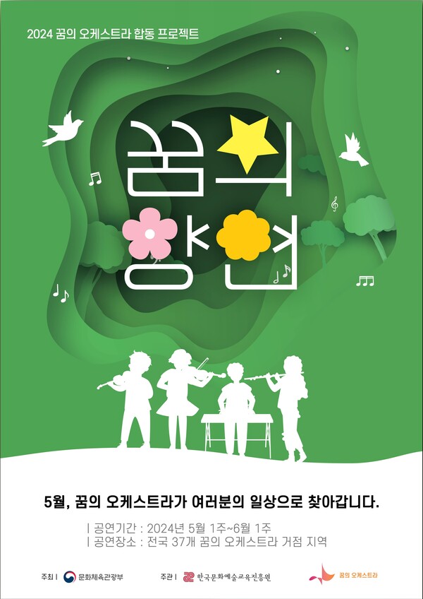 세계문화예술교육 주간을 맞아 전 국민이 함께 즐길 수 있는 참여형 행사도 마련된다. 먼저 지난 4월 말부터 꿈의 오케스트라 동시 공연 프로젝트 ‘2024 꿈의 향연’이 전국 37개 지역에서 진행되고 있다. 사각지대 없이 국민 누구나 문화예술을 누릴 수 있도록 전국 꿈의 오케스트라 참여 단원들이 기차역·공원·병원·아파트 등 다양한 일상의 공간에서 약 40,000여 명을 대상으로 풍성한 연주가 펼쳐진다.