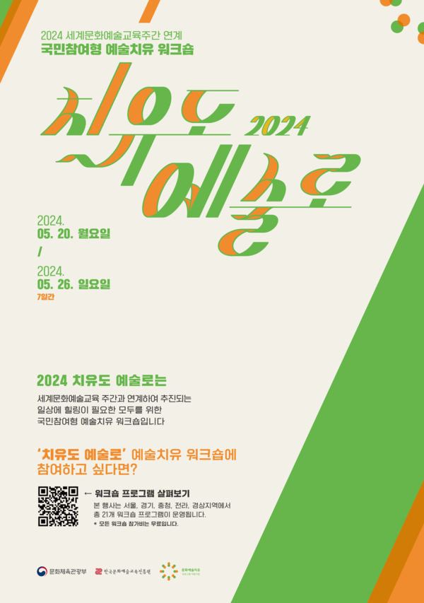 또한 대국민 예술치유 워크숍 ‘2024 치유도 예술로’가 20일(월)부터 26일(일)까지 전국 21곳에서 열린다. 미술·음악·무용 등 분야별 예술가와 예술치료사들이 일상에 치유와 회복이 필요한 청소년, 청장년, 노년과 예술로 상호작용하며 힐링의 시간을 가질 예정이다.