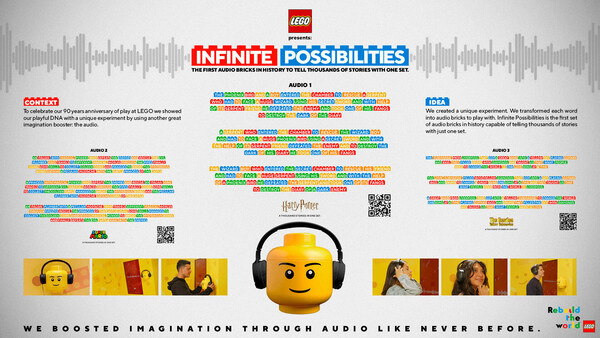 이 중에는 자연스러운 상상력을 자극하는 독특한 경험인 오디오가 있었다. '무한한 가능성(INFINITE POSSIBILITIES)'은 똑같은 브릭 세트로 서로 다른 이야기를 들려주는 최초의 오디오 브릭을 만드는 청각 실험이다. 레고는 이전과는 다른 방식으로 오디오를 통해 소비자와 소통하고 상상력을 자극하는 다양한 재미를 선사할 수 있다는 것을 증명했다.