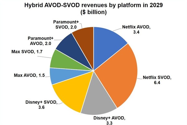 디지털 TV 리서치의 분석에 따르면 미국 구독 스트리밍 서비스인 넷플릭스, 디즈니+, 맥스, 파라마운트+는 SVOD(구독 기반 스트리머)와 AVOD(광고지원 스트리머) 합산 수익이 2023년 70억 달러에서 2029년 240억 달러로 증가할 것으로 예상했다. SVOD는 2023년 36억 달러에서 136억 달러로 하이브리드 수익의 절반을 차지할 것으로 예상된다. AVOD는 102억 달러로 2023년의 31억 달러에 비해 증가할 것이다.