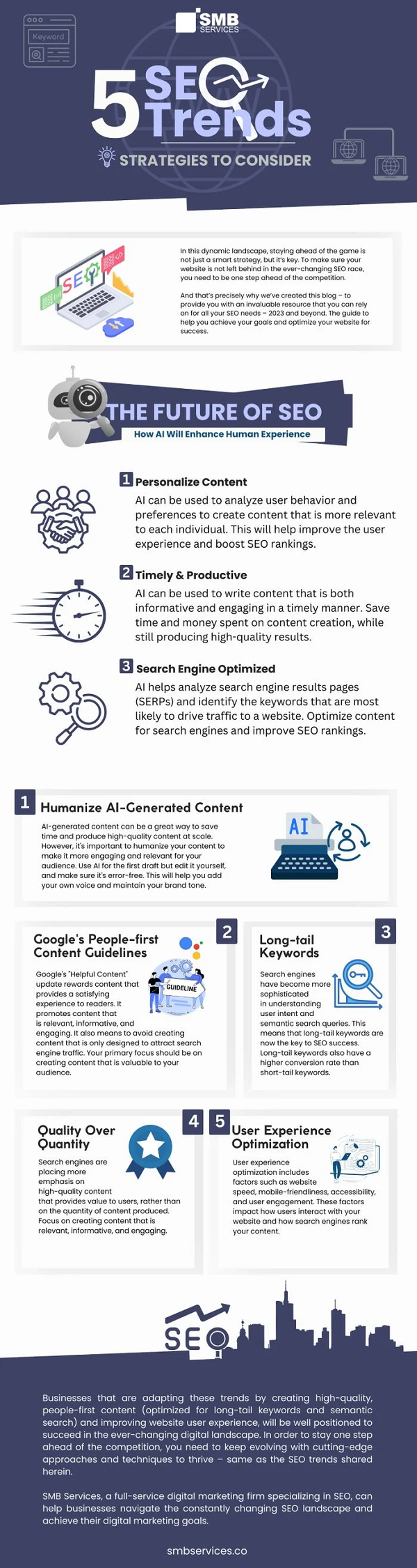 즉, 기업은 시장 관련성을 유지하고 디지털 마케팅에서 경쟁력을 유지하기 위해 2023년 이후의 전략에서 고려할 상위 5가지 SEO 트렌드를 SMB Services는 제안했다.