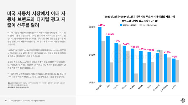 2023년 2분기부터 2024년 1분기까지 ‘현대자동차’는 미국에서 전년 동기 대비 42% 증가한 2억달러가 넘는 디지털 광고를 집행해 ‘포드(Ford)’를 제치고 1위에 올랐다. ‘토요타 자동차’가 미국에서 지출한 광고 비용은 안정적이었는데, 2023년 2분기부터 2024년 1분기까지 3% 증가한 1억5000만달러를 지출하며 3위를 마크했다.