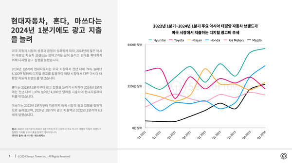 미국 자동차 시장의 성장과 경쟁이 심화됨에 따라 2024년 많은 아태 자동차 브랜드는 잠재고객을 끌어 들이고 판매를 확대하기 위해 디지털 광고 집행을 늘렸다. 2024년 1분기에 ‘현대자동차’는 미국 시장에서 전년 대비 74% 늘어난 6100만달러의 디지털 광고를 집행해 다른 아시아-태평양 자동차 브랜드를 앞섰다. ‘혼다’도 2023년 3분기부터 광고 집행을 늘리기 시작해 2024년 1분기에는 전년 대비 130% 늘어난 4800만달러를 지출하며 ‘현대자동차’의 뒤를 이었다.