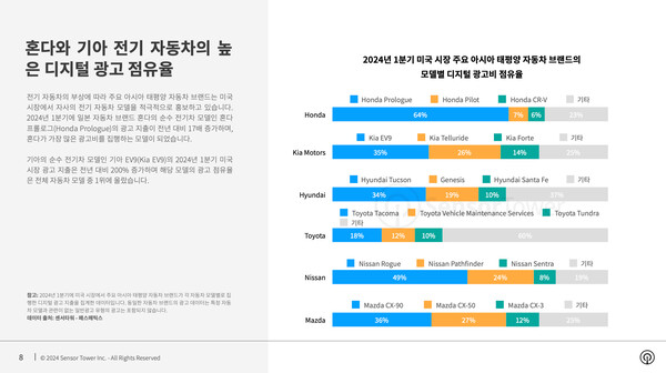 전기자동차의 부상에 따라 주요 아시아-태평양 자동차 브랜드는 미국 시장에서 자사의 전기 자동차 모델을 적극적으로 홍보하고 있다. 2024년 1분기 미국 시장 주요 아태 자동차 브랜드의 모델별 디지털 광고비 점유율을 보면 ‘기아(Kia Motors)’의 순수 전기차 모델인 ‘기아 EV9(Kia EV9)’의 2024년 1분기 미국 시장 광고 지출은 전년 대비 200% 증가하며 해당 모델의 광고 점유율이 전체 자동차 모델 중 1위에 올랐다.